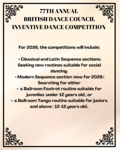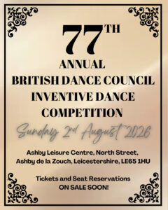 2) The BDC Inventive Dance Competition will take place once again on Sunday 2nd August at Ashby De La Zouch Leisure Centre in Leicestershire. Further details and entry forms will be available from the BDC office in due course.