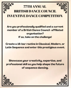 Inventive Dance Competitions are competitions to find an original sequence dance, usually of 16 bar duration. The prize-winning dances are then used by social dancers and they are also used for sequence examinations and competitions. Inventive Dance Competitions may be held in Classical Sequence, Modern Sequence and Latin Sequence and they are open to professionally qualified teachers of dancing.